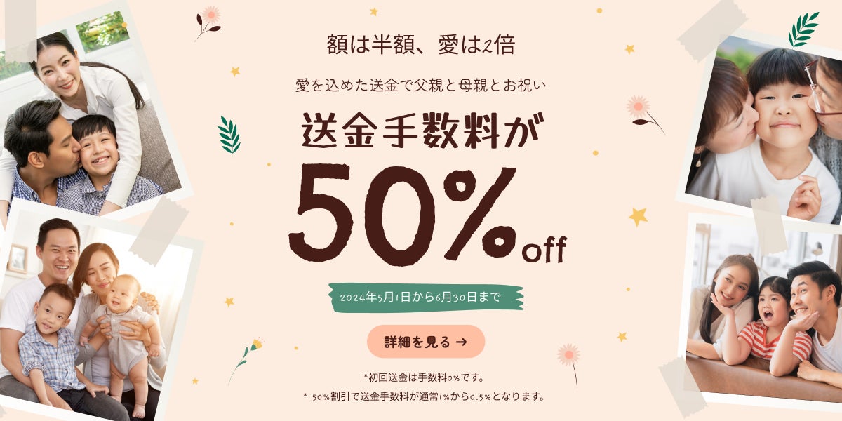 母の日と父の日が近づく中、家族への感謝の気持ちをより特別なものにするため、Curfexは期間限定で送金手数料を1%から0.5%に引き下げることを決定しました。この特別なキャンペーンは、母の日(5月12日)と父の日(6月16日)を含む2024年5月1日から6月30日の期間に実施されます。