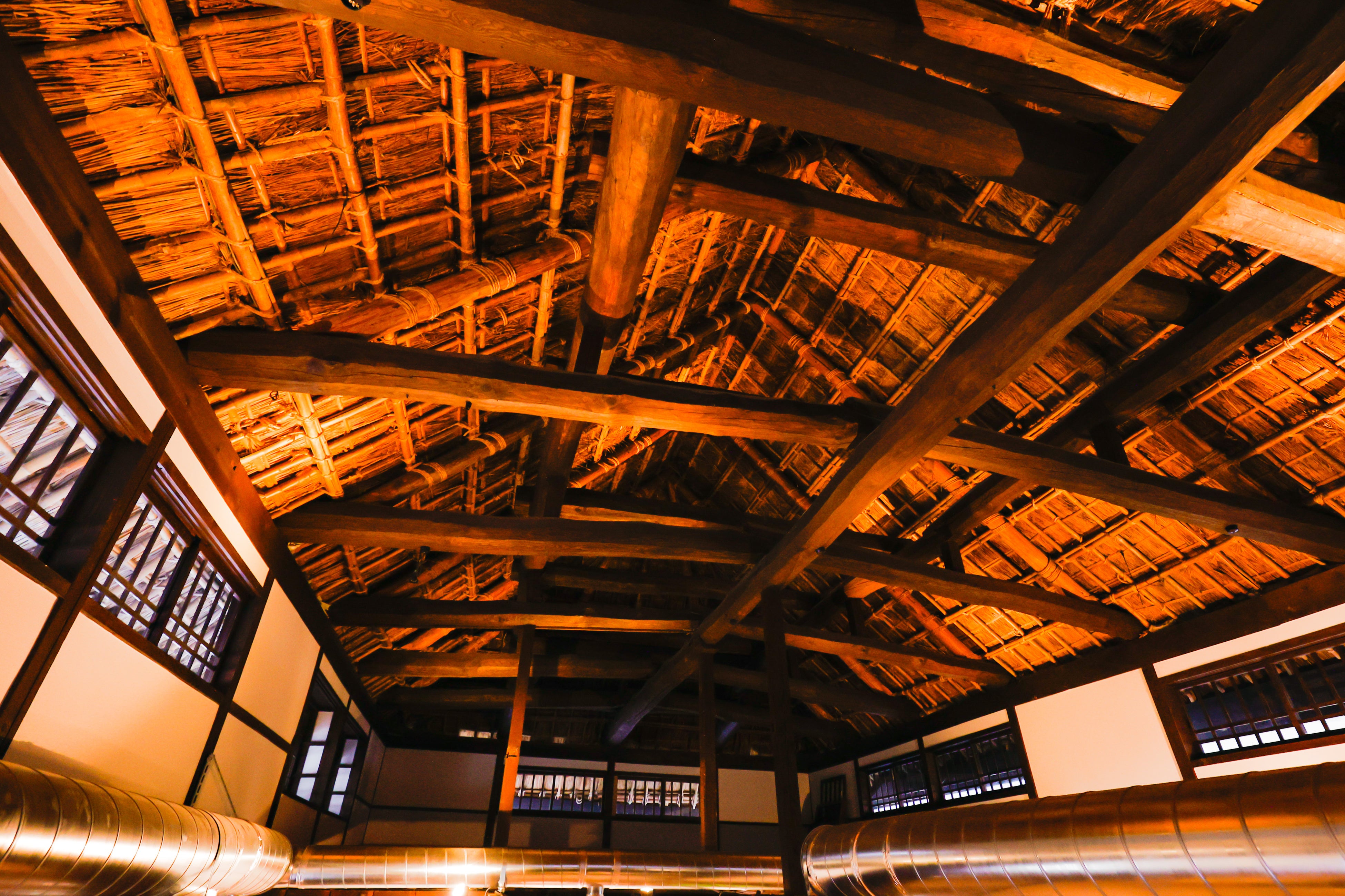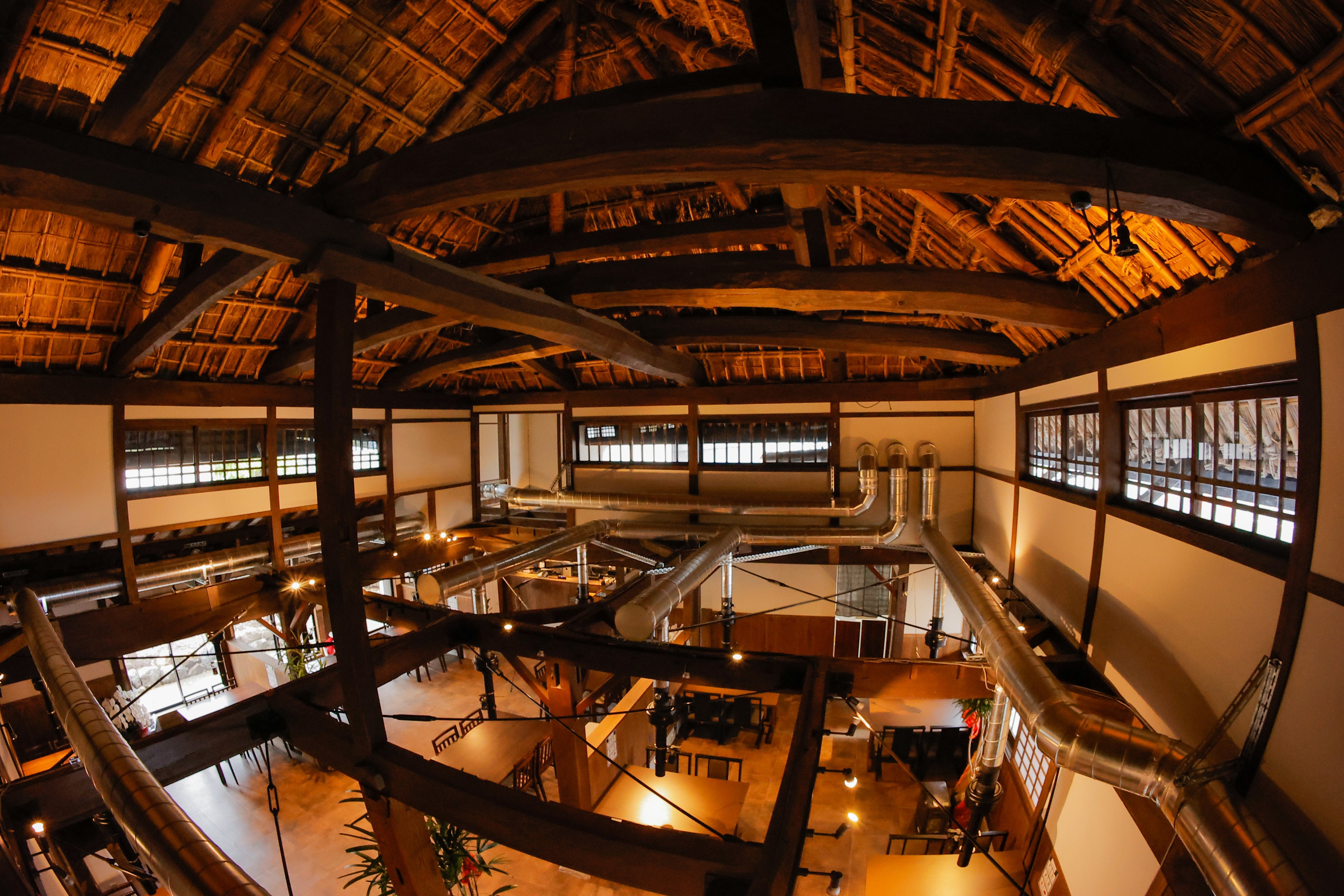 店内は木の質感を活かした温もりあふれる造りにリノベーションしており、上を見上げると竹を組んだ屋根の下地が見え、茅葺屋根の名残が窺えます。どうすれば日本古来の伝統技術を目でもお楽しみいただけるか、試行錯誤しながらリノベーションのプランを考えました。