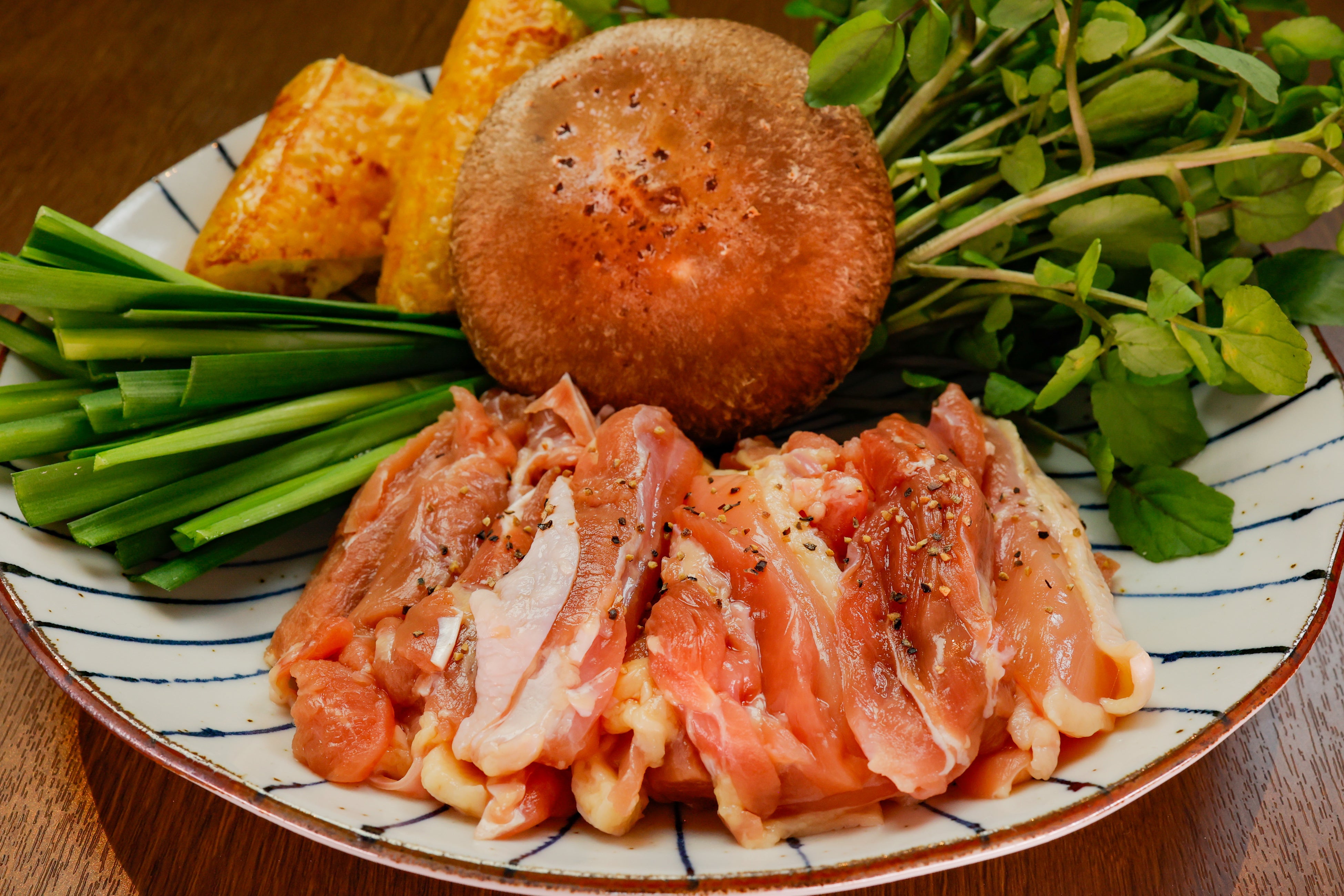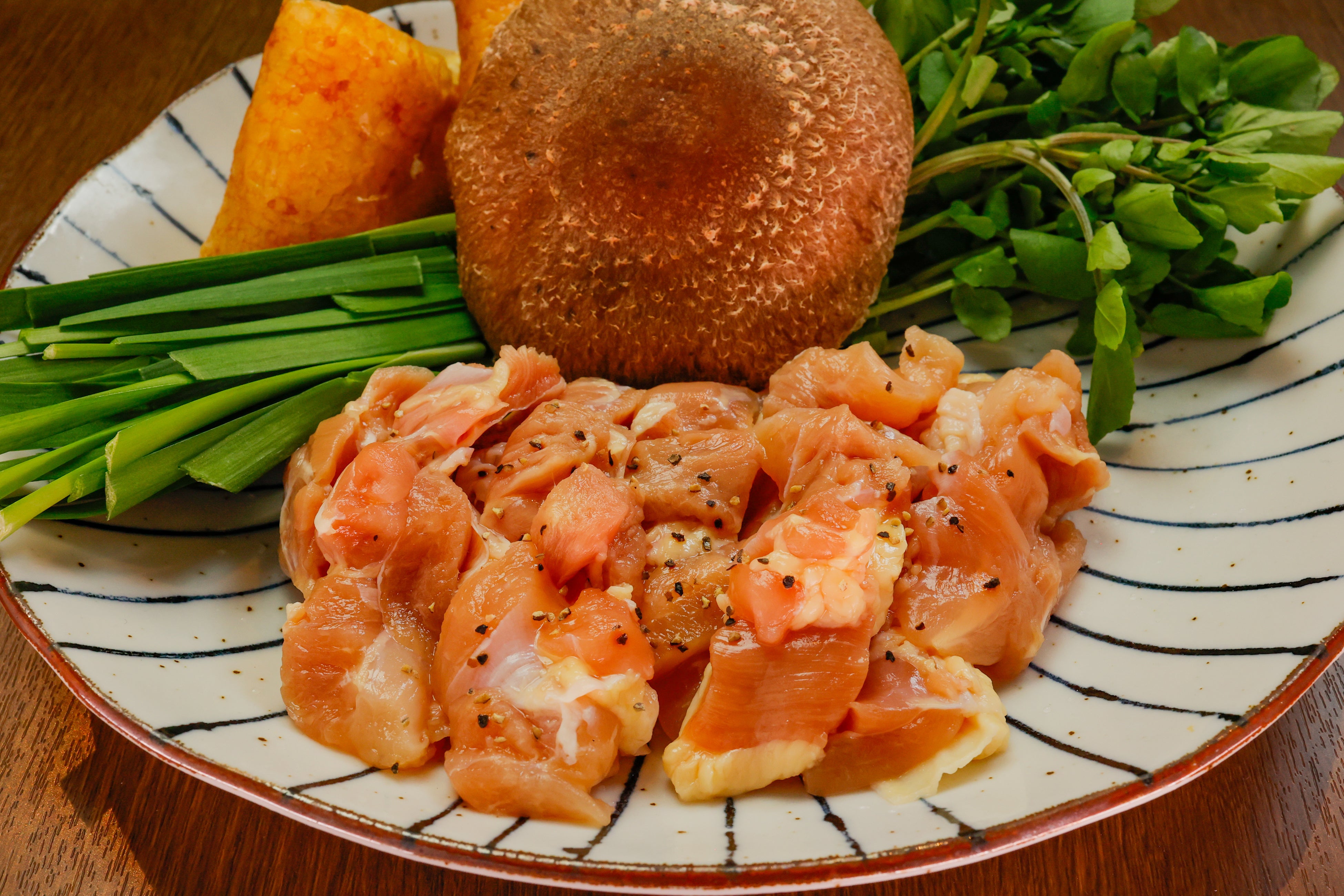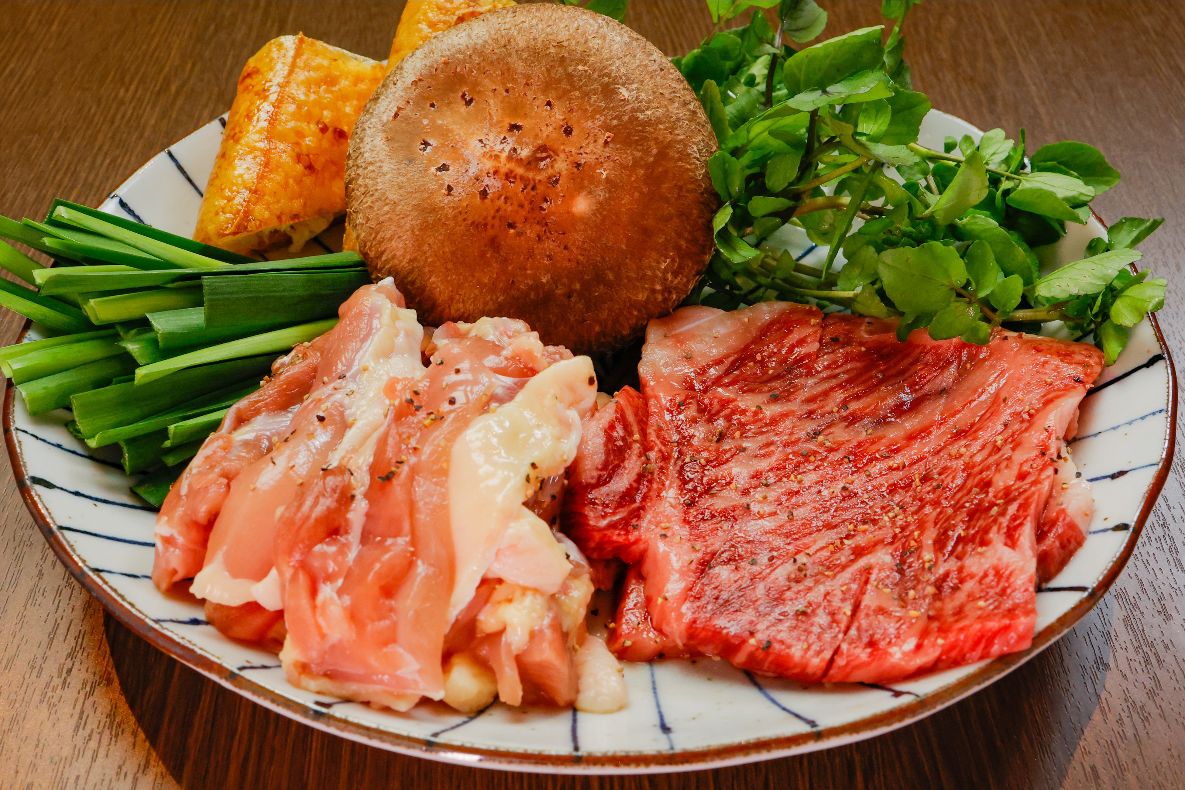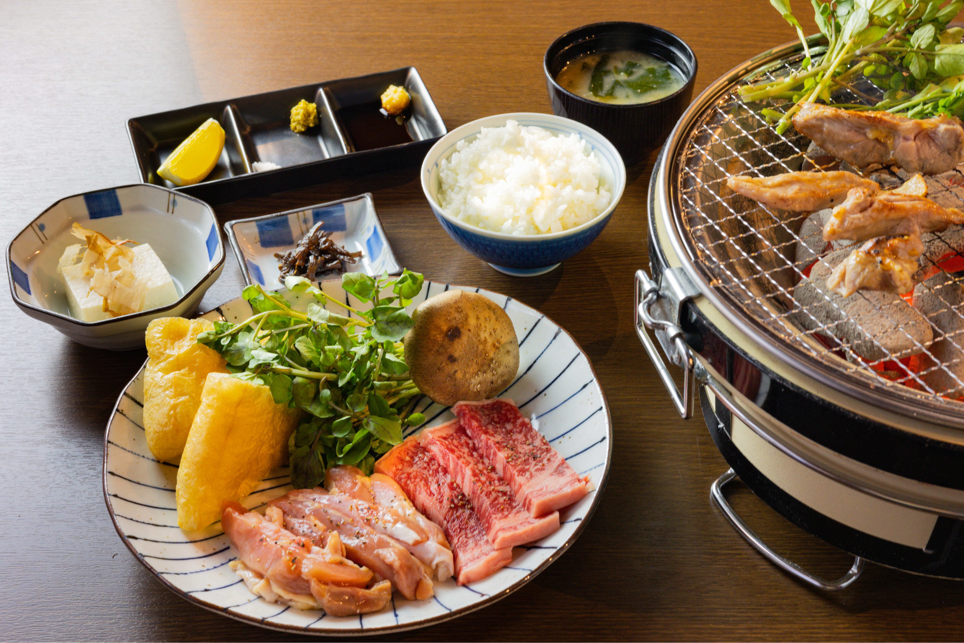 啓修庵の顔とも言えるメイン食材は、大分を代表する「豊後牛」や「冠地鶏」、秘伝のタレに付け込んだ「タレづけ鶏」をご用意しております。野菜や油揚げなども、由布院を始めとする地元の生産者から食材を仕入れることで、鮮度が高く、おおいたの味力たっぷりなお食事をご堪能いただけます。