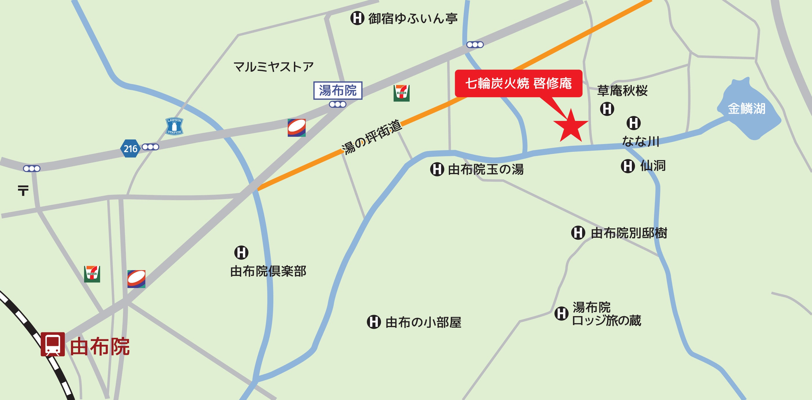 JR由布院駅から徒歩15分。旧九州湯布院民芸村敷地内にあります。