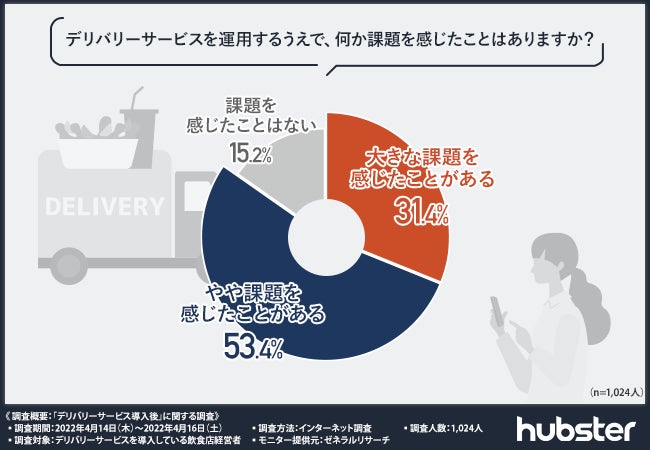 そこで、「デリバリーサービスを運用するうえで、何か課題を感じたことはありますか?」と質問したところ、『大きな課題を感じたことがある(31.4%)』『やや課題を感じたことがある(53.4%)』『課題を感じたことはない(15.2%)』という結果となり、実に8割以上の飲食店経営者が、デリバリーサービスの運用で課題を感じた経験を持っていることが分かりました。