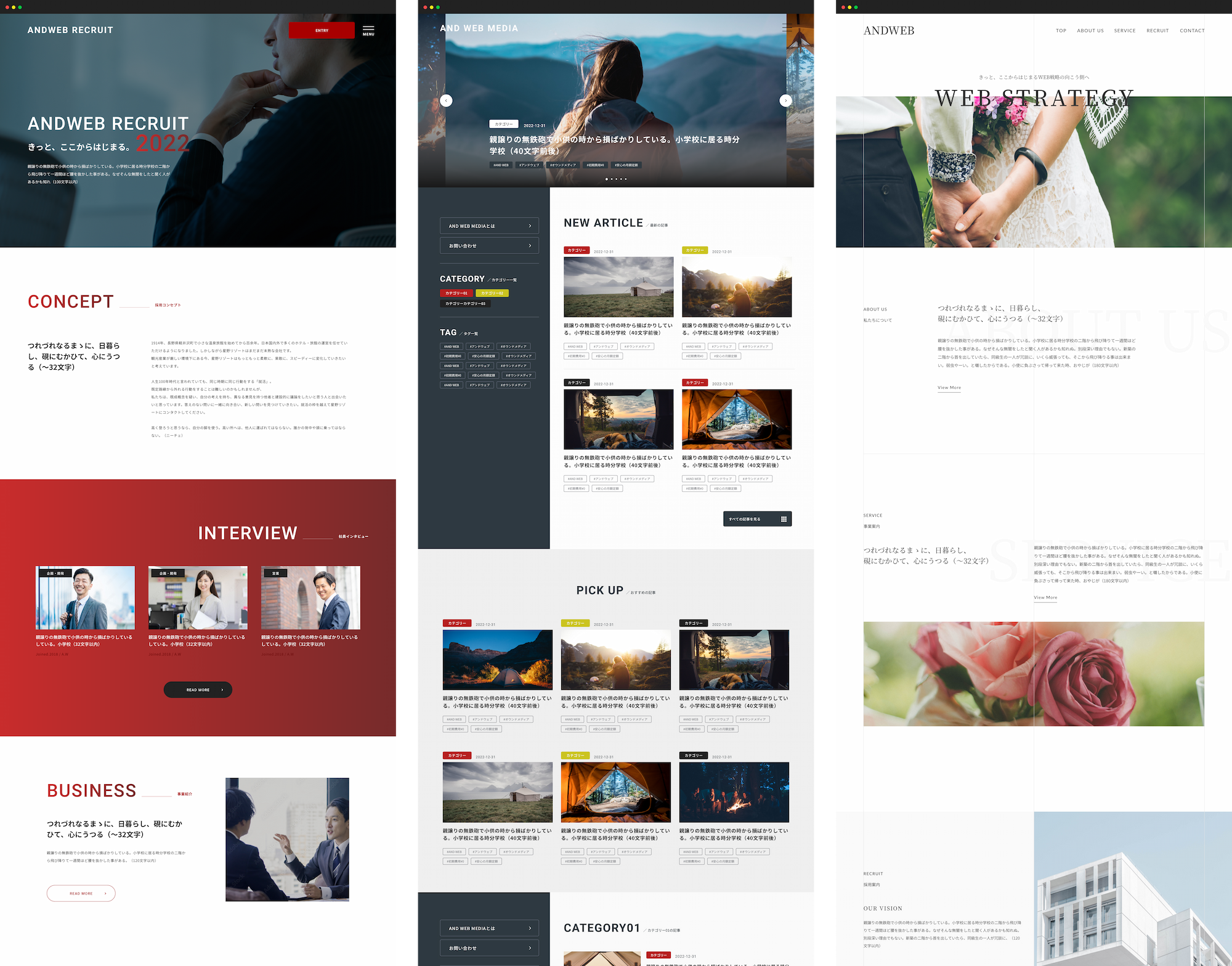 企業サイト(コーポレートサイト)、商品・サービスサイト、採用サイト、オウンドメディアなど