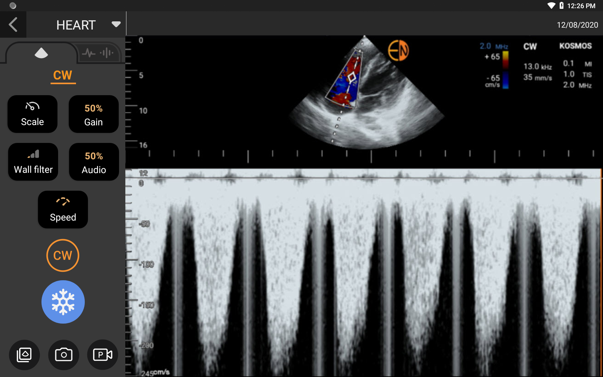 CW・PWドプラ計測では、血流速度、圧較差計測、VTIオートトレース計測、PHT計測などにも対応しており、携帯性に優れた8インチのタブレット型超音波であっても、大動脈弁狭窄症などの弁膜症の定量的評価、心不全、その他循環器疾患の定量的評価が行えることで、循環器領域に加え、救急、集中治療、麻酔科、在宅医療、訪問診療、クリニックなど、多様な診療科と臨床現場におけるポイント・オフ・ケア超音波検査を力強くサポートすることが可能となっている。