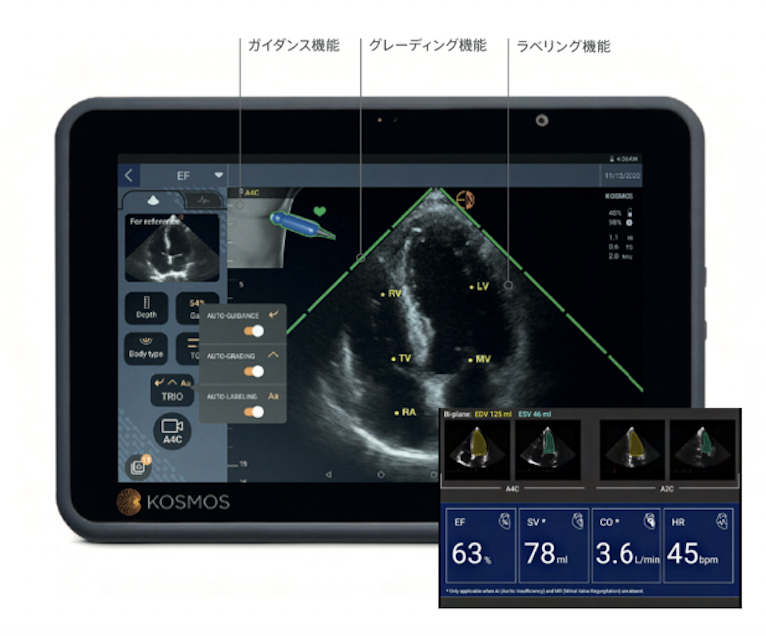 また「KOSMOS Series」搭載の、AI技術を活用して開発された「TRIO機能」は、オートラベリング機能(解剖構造表示)、オートグレーディング機能(至適断面描出レベル表示)、オートガイダンス機能(至適断面描出ガイダンス表示)、の3つの機能のサポートにより、より正確なEF(駆出率)、SV(一回拍出量), *CO(心拍出量)*HR(心拍数)を僅か最短約十数秒以内に計測可能である。(*ECGをTORSOに接続時)