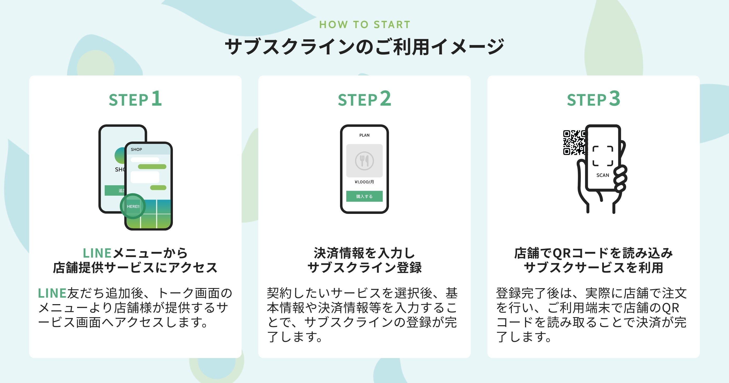 サブスクラインは、飲食店・サロン向けに、店舗事業者がLINEで手軽なサブスクリプションサービスを構築できるシステムを提供し、新たな経営ビジネスをサポートします。