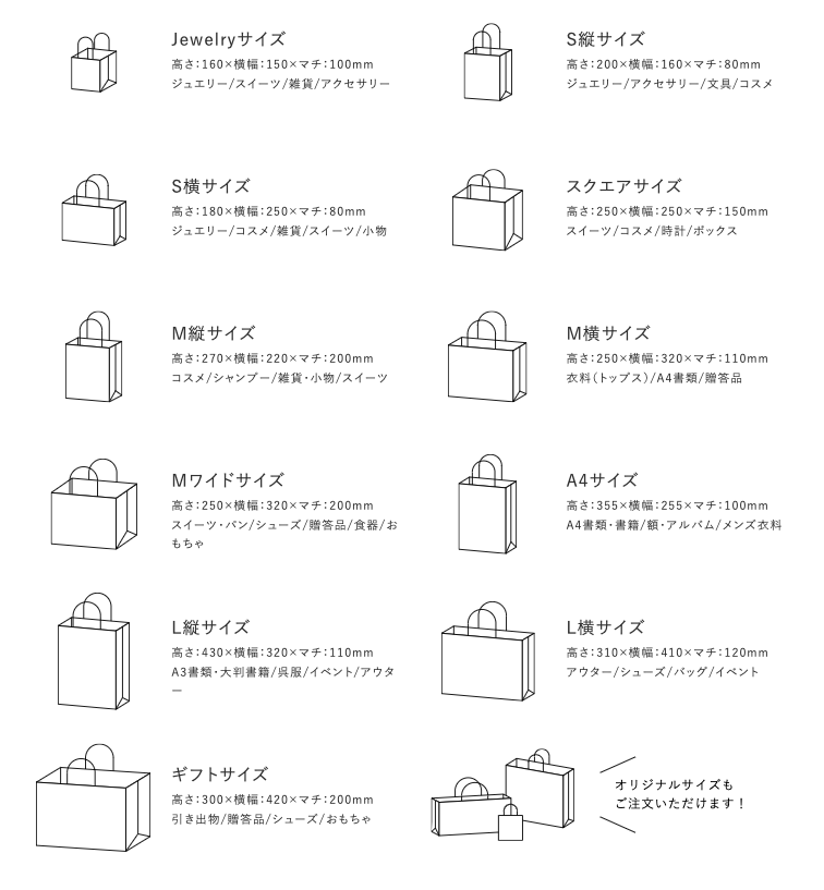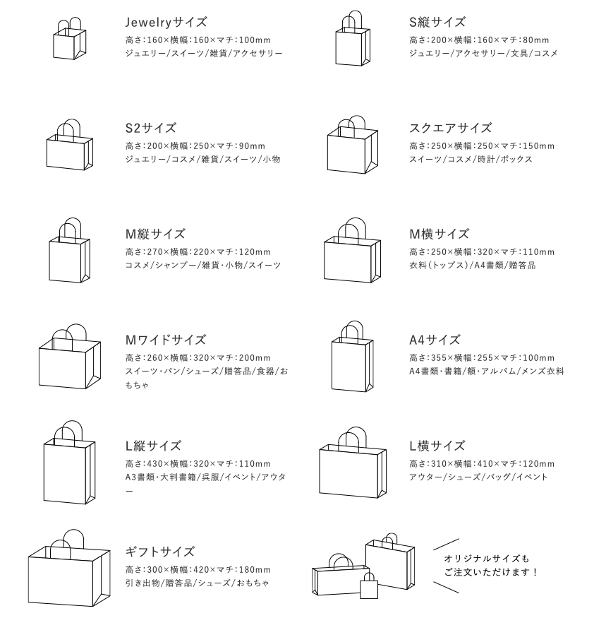 サイズは様々な業種に対応できる、11サイズをご用意しております。もちろん商品に合わせたオリジナルサイズでの作成も可能です。