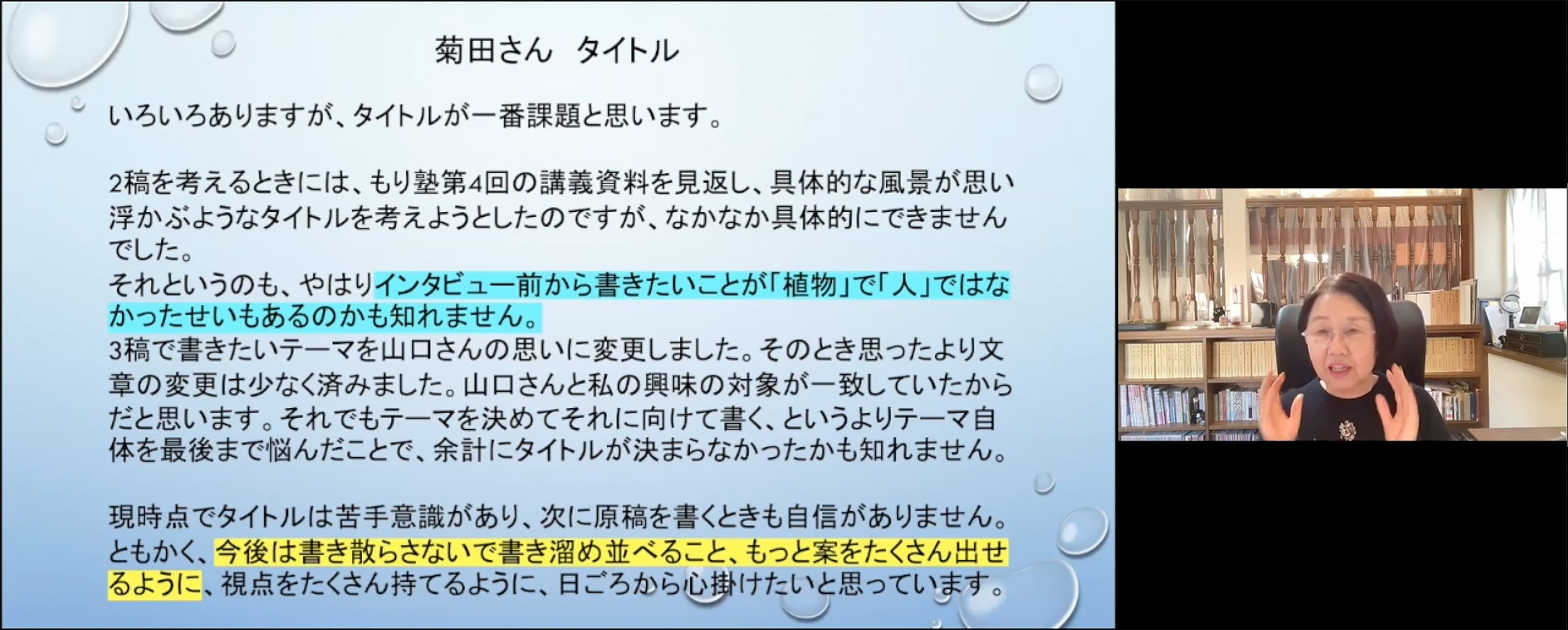 - 他の受講生のさまざまな文章に触れることも勉強になった。