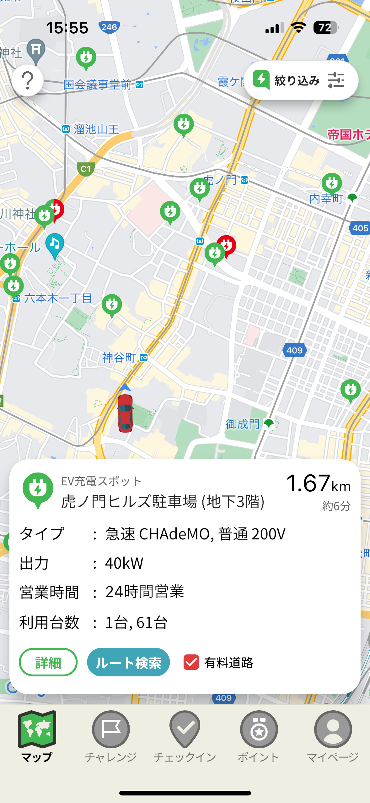 1.全国のEV充電スポット表示&検索機能(詳細情報紹介とルート検索可)
