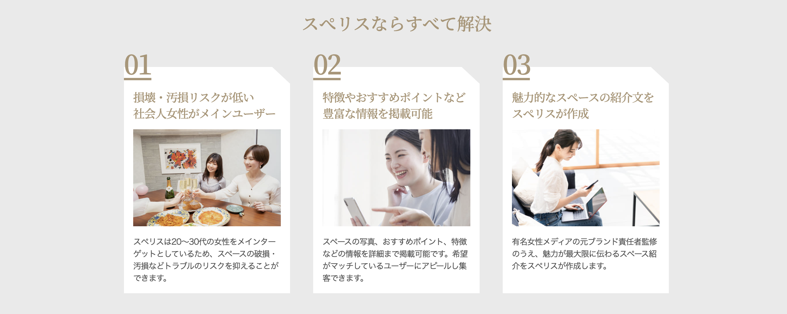 スぺリスで理想のスペース運営を。スペースの魅力的な紹介、破損リスクの抑制、すべてスぺリスにお任せください。