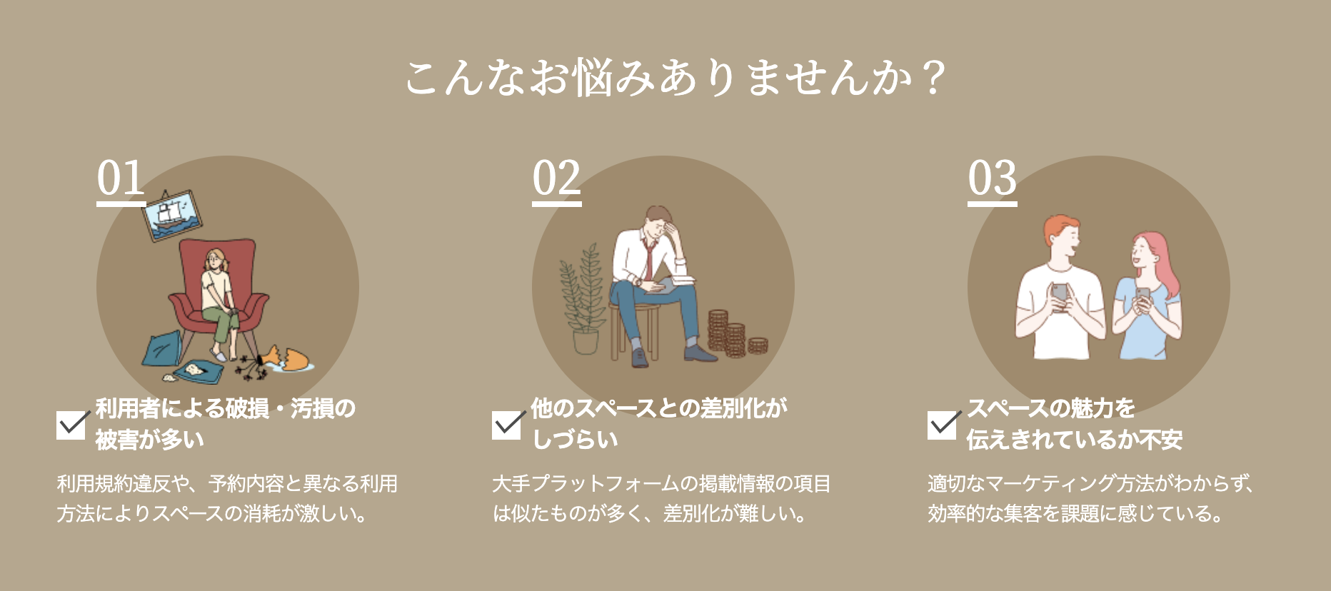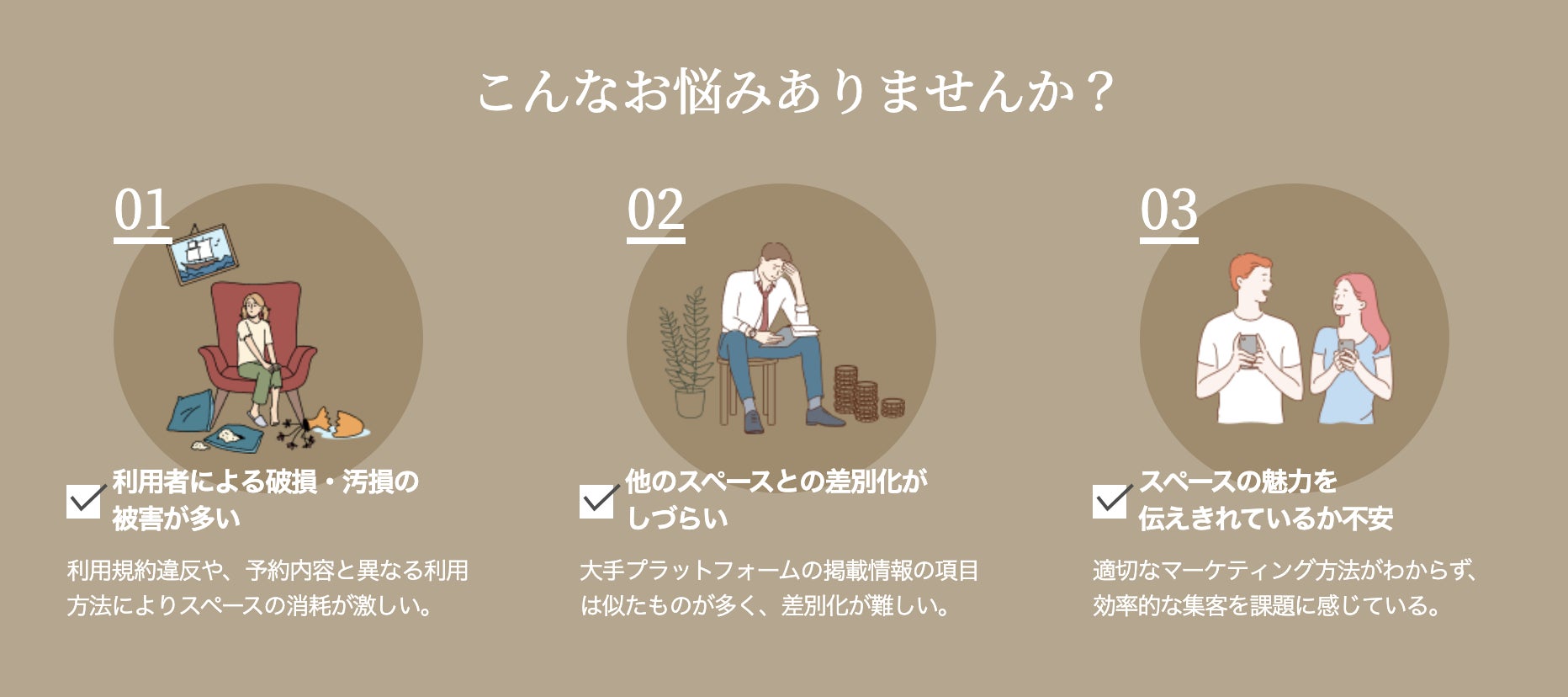 上記スペースを運営する際の問題を鑑みて、当社ではオーナーに安心してスペースを貸し出す環境をつくるため、3つの解決策を提案いたします。