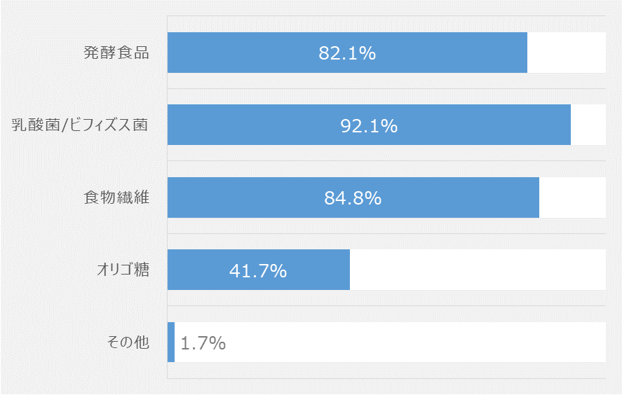 また、腸活に良いとされる成分や食材として思い浮ぶものを全て教えてください。という質問では約9割のユーザーが「乳酸菌、ビフィズス菌」と回答していることから、性別や年代、「腸活」の実践有無を問わず、「乳酸菌/ビフィズス菌」が腸活と紐づいて認知されていることが明らかになりました。