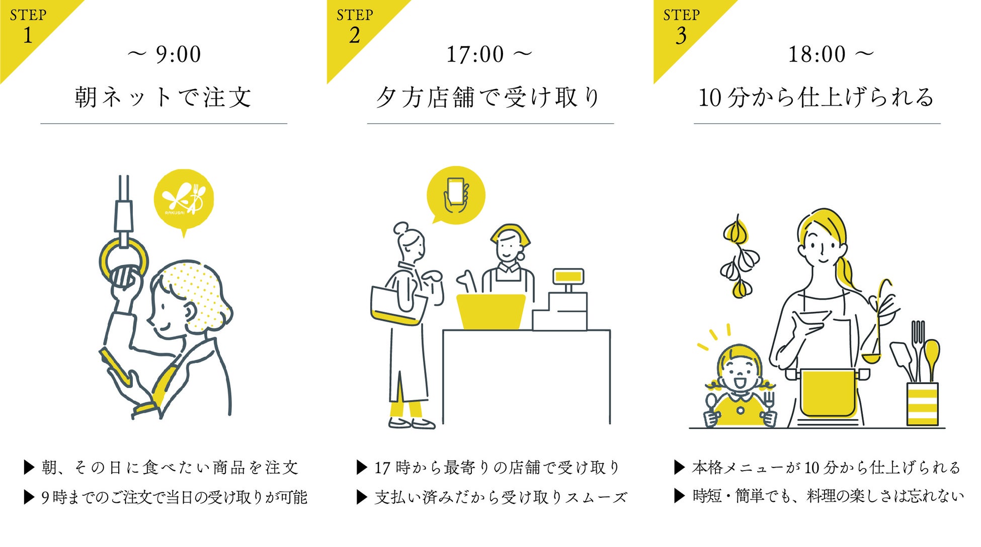 提携先企業のお好きな店舗で商品ピックアップを実現し、その日に注文したミールキットが食卓に並びます。通勤・通学帰りのエキナカでのショッピングや、キャンプ場でのイベントメニューなど、お客様のライフスタイルにあった生活動線に合わせ、その日のうちに受け取れる仕組みで楽彩のある日常を提案していきます。