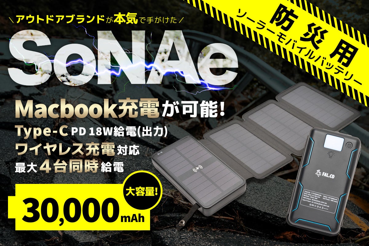 ソーラー機能搭載の大容量モバイルバッテリー「 SoNAe (ソナエ)」は、新進気鋭のアウトドアブランド FAL.CO(ファルコ) の手がけるソーラー機能を搭載した大容量モバイルバッテリーです。
