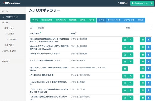 - 協会や団体の注意喚起や流行りの攻撃メールも参考に訓練シナリオギャラリーの随時Update。ご希望の訓練内容がある場合は、作成代行もお受けします。