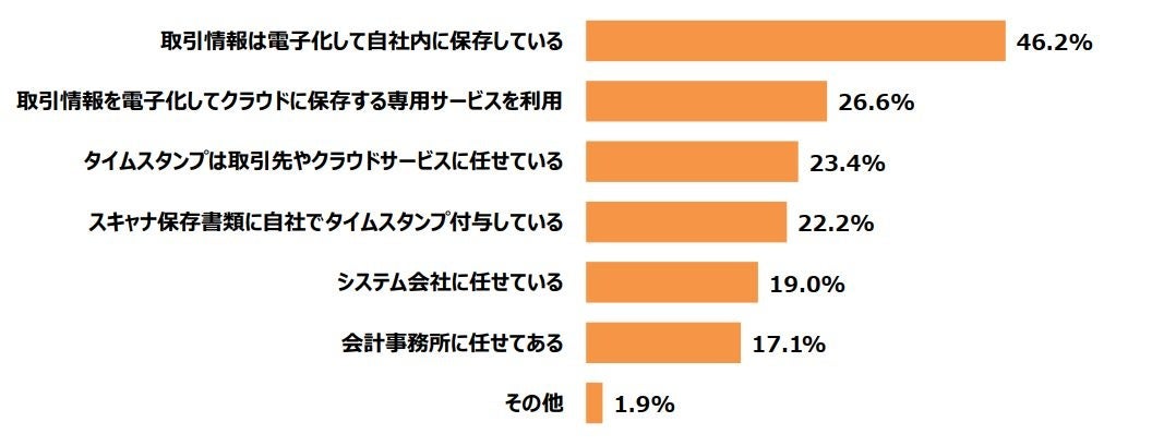 ・対策方法は「取引情報は電子化して自社内に保存している」との回答が約半数。「クラウド上に保存する専用のサービス」よりも約20ポイント高い結果となった。