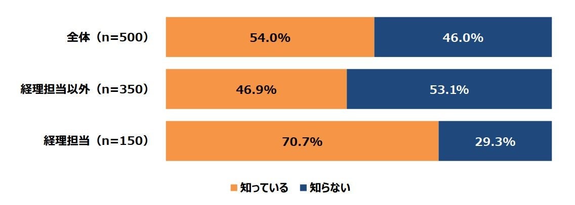 ・改正電子帳簿保存法の認知は54.0%と半数。経理担当でも認知は7割程度。経理担当以外では半数に満たない結果に。「すでに対策済である」は28.1%にとどまる。多くの企業が2年の猶予期間に対策をとるようだ。