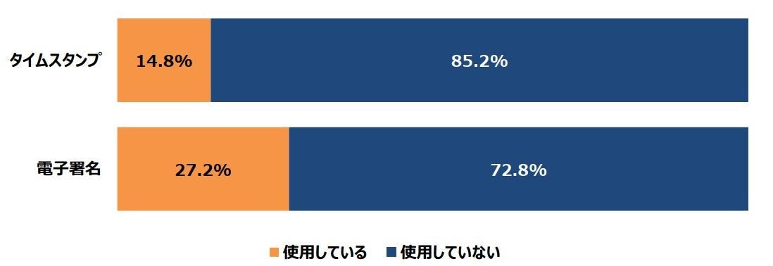 ・「タイムスタンプ」、「電子署名」の利用はどちらも3割に満たない結果に。