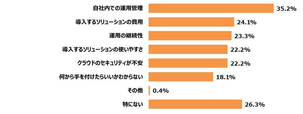 ・電子帳簿保存法が改正されたことで、負担に感じることや不安だと思うことをお聞きすると、最も多い回答は「自社内での運用管理」となり35.2%という結果に。次いで「導入するソリューションの費用」24.1%、「運用の継続性」23.3%となった。