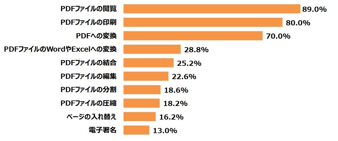 ・PDFで行うことは「PDFファイルの閲覧」が最も多く89.0%。「PDFファイルの印刷」80.0%、「PDFへの変換」70.0%と続きPDFが業務にとって必要不可欠な存在であることがわかる。