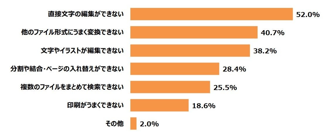 ・PDFソフトについて61.6%が「困ることがある」と回答。「直接文字の編集ができない」52.0%、「他のファイル形式にうまく変換できない」40.7%、「文字やイラストが編集できない」38.2%など、PDFソフトを使用しているものの、編集関連に対し、困っている方が多い。