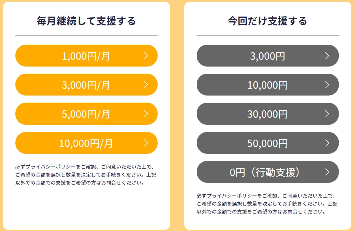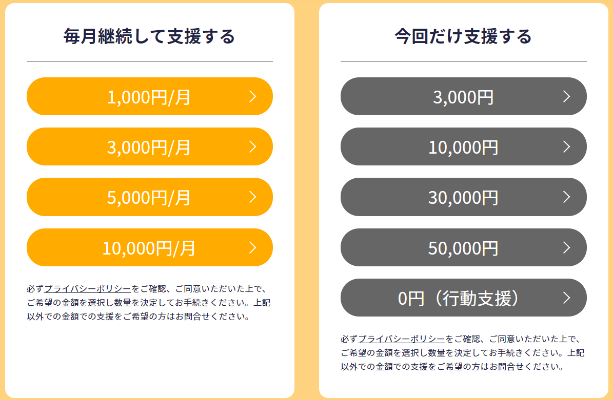 寄付は1回限定と、サブスクリプションがあります。金額もそれぞれ4,5種類から選択が可能です。また、0円寄付としてお金ではなく行動で支援する方法について掲載しています。なお、WDRACは現地のニーズに見合った臨機応変な支援を重視し、物資の提供ではなく支援者の活動資金援助に注力します。