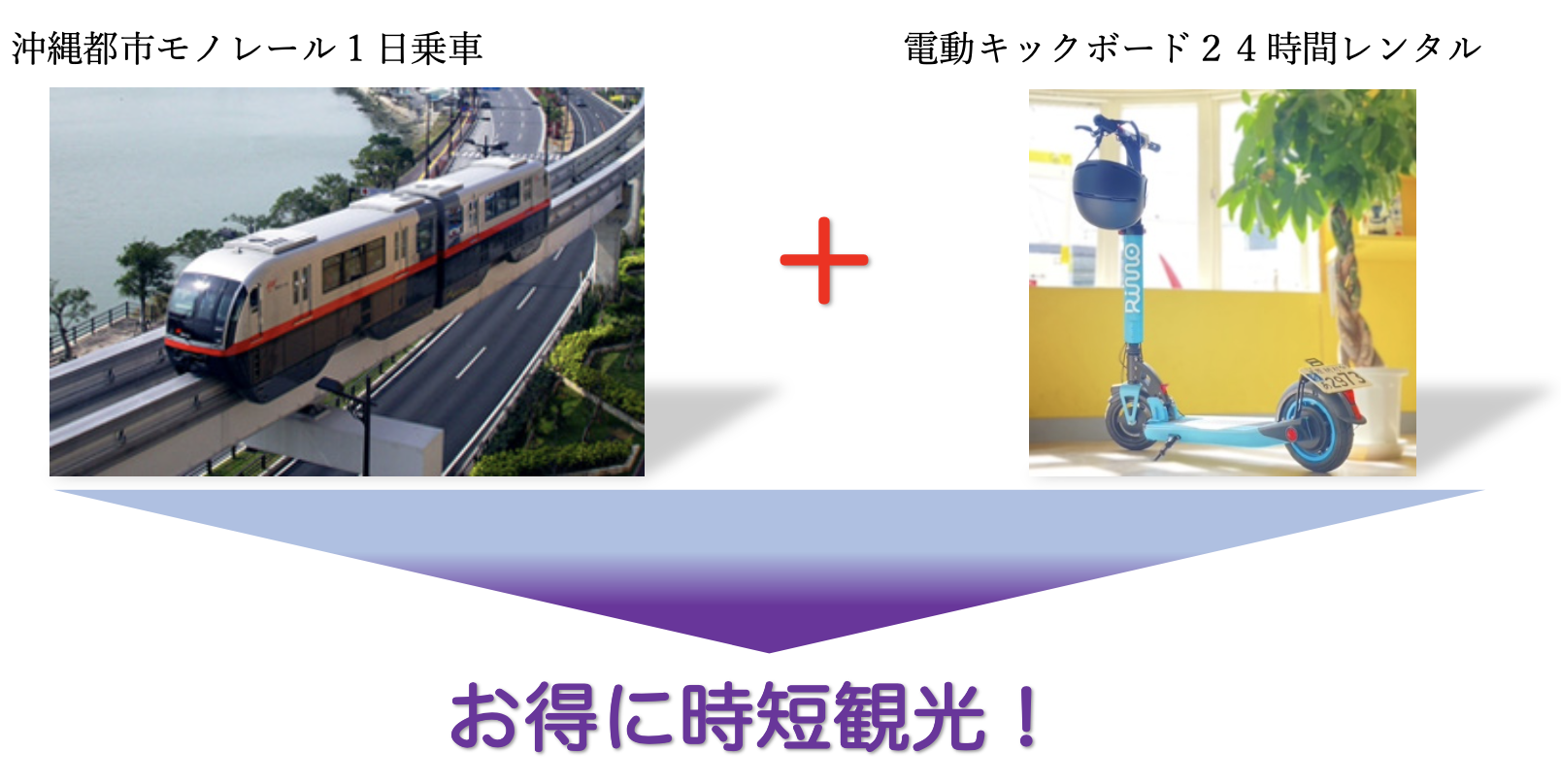 沖縄 MaaS との事業連携により、「沖縄都市モノレール 1 日乗車券」×「電動キックボード 24 時間レンタル」 のセットを事前に購入することが可能となります。沖縄 MaaS とは、沖縄独自の観光型 MaaS により、県内の 交通課題解決を目的に、様々な交通公共機関や市町村、企業などが連携して提供しているサービスです。