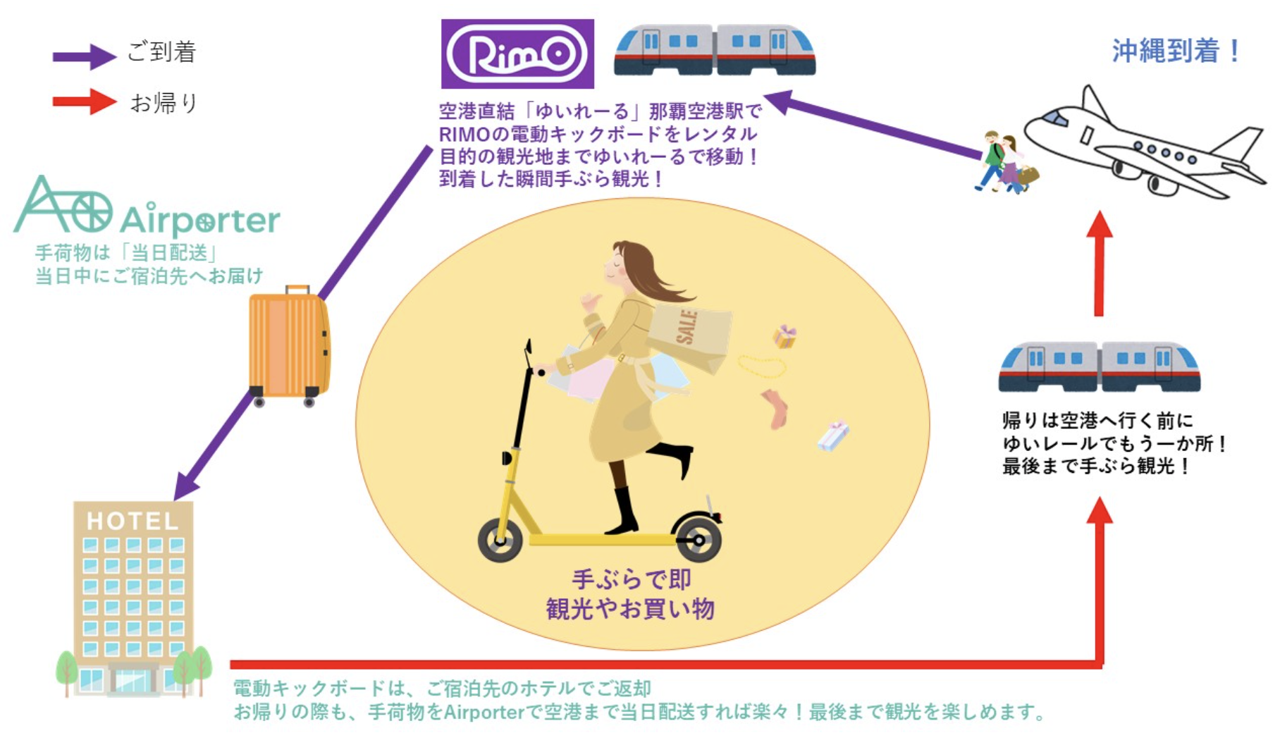 3 お客様が電動キックボードで観光している間に、Airporter が宿泊ホテルまで荷物をお届け 4 電動キックボードは宿泊ホテルで返却(Airporter が RIMO へ当日配送にて返却を代行)