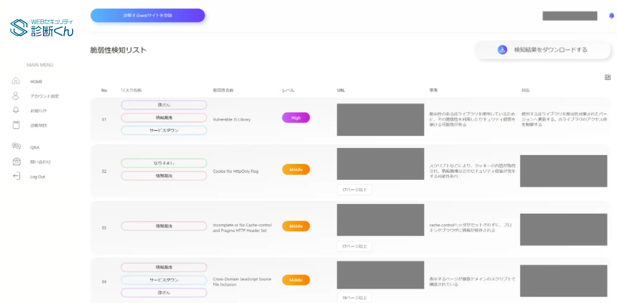 1.WEBセキュリティ診断くんは簡単な登録作業で診断を開始することが出来る。診断後はサイトに潜むリスクを数値化して表示することで「誰でも」サイトの現状を一目で理解することが可能となった。