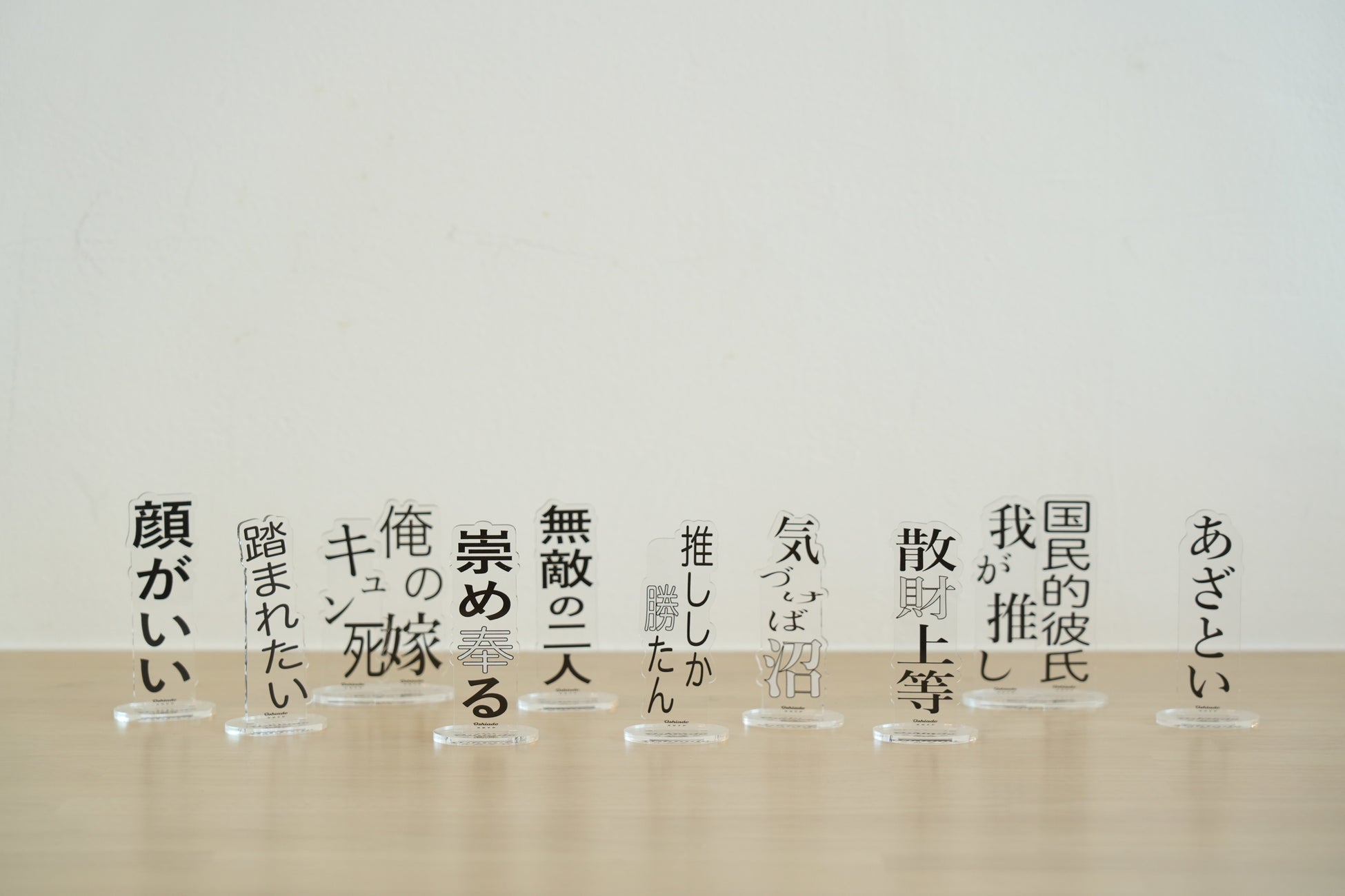 「推し文字アクスタ」(税込580円)は、「愛してる」「お顔が天才」「リアコ案件」といった推しへの思いがプリントされたアクリルスタンド。ワードは全20種×2パターン分用意されており、購入いただいた方にはその中からランダムでスタンドが当たります。