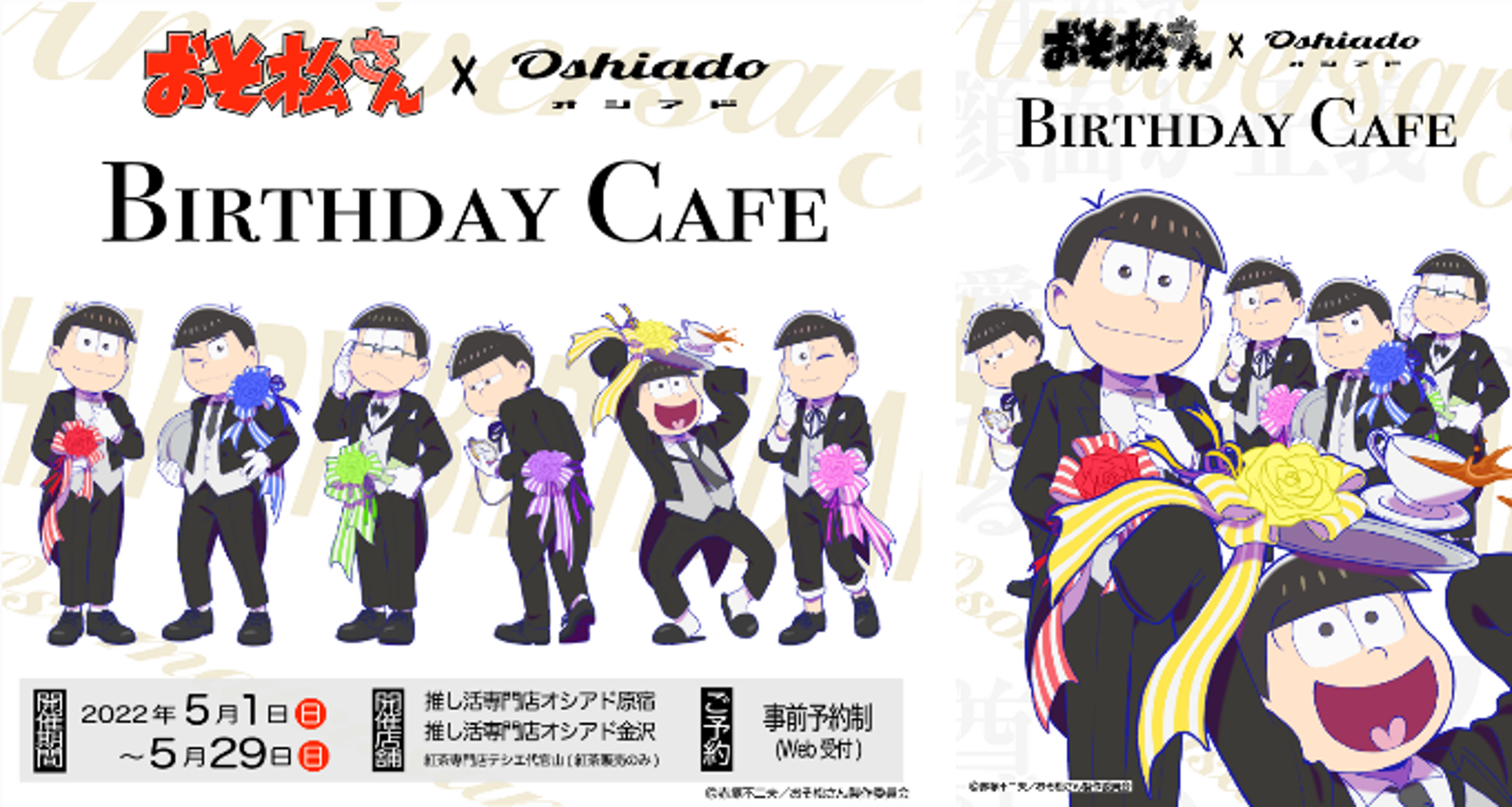 5/1(日) ~5/29(日)の期間限定で、大人気アニメ「おそ松さん」とのコラボ企画「BIRTHDAY CAFE」を開始予定です。5月は「おそ松さん」キャラクターの6つ子の誕生日月でもあり、ファンの方々にとっては誕生日を祝う、特別なイベントとなります。「おそ松さん」コラボカフェにつきましては、下記サイトをご確認ください。