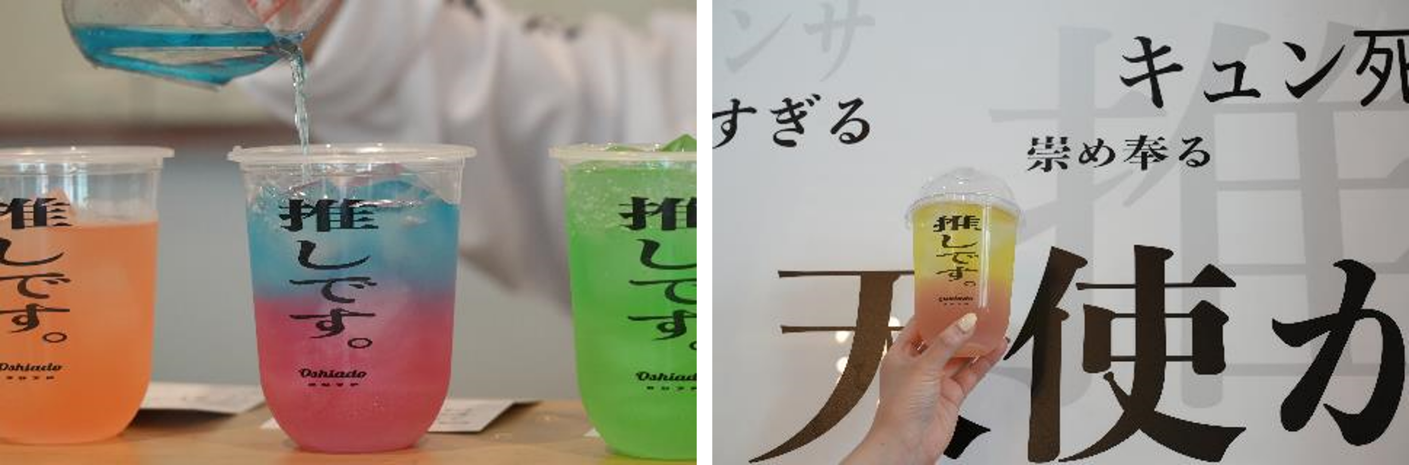 推し茶(税込780円)は、推しのイメージカラーと香りを具現化したティーソーダ。 専用のオーダーシートに推しの名前・プロフィール・イメージ・カラーを書き込んで注文すると、上部6カラー、下部12カラーの組み合わせから、最適なカラーと香りのドリンクを提供します。推し茶に使用されているお茶は、代官山の紅茶専門店「THÉSIER(テシエ)」が監修しており、本格的なお茶の風味もお楽しみいただけます。