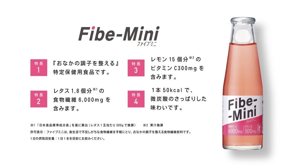 ○許可表示:ファイブミニは、食生活で不足しがちな食物繊維を手軽にとり、おなかの調子を整える食物繊維飲料です。