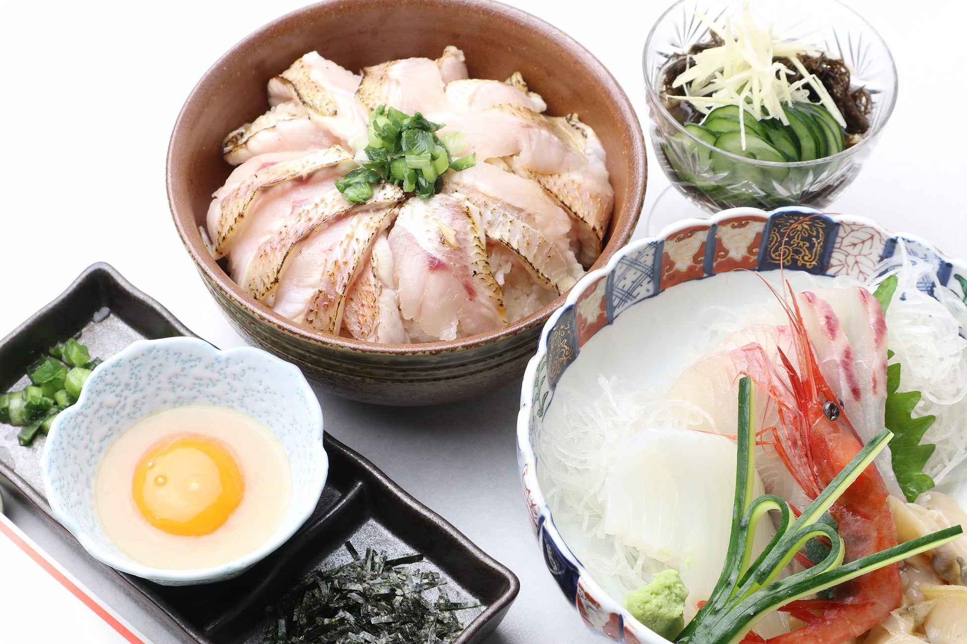 内容:だし卵のノドグロ丼、小鉢、お刺身の盛り合わせ