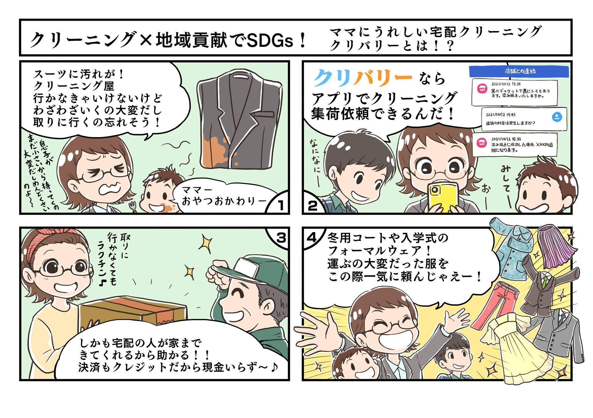 「クリーニング」&「デリバリー」で「クリバリー」。ヤマト運輸様と提携し、クリーニング店に行く”手間“をなくしたサービスです。宅配クリーニングだから、全国どこからでも利用しようと思えば出来ますが、敢えて店舗の所在地である海老名市と綾瀬市限定のサービスです。理由は、移動コストを極力減らしたいことと、いざという時に直接お客様とやり取りが出来るようにしたいとの思いから地域限定にしました。クリーニングは地域のクリーニング店へ。そうすれば、地域の循環や活性にもつながります。また、環境、社会、経済の課題解決につながるサービスです。