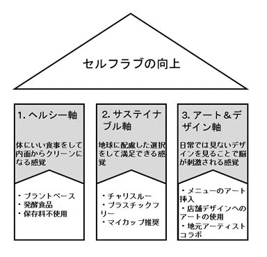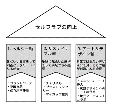 ・「アート&デザイン軸」では、メニューへのアートの採用、店舗デザインへのアートの使用、地元アーティストコラボなど、によって日常では見ないデザインを見ることで脳が刺激される感覚を目指しています。