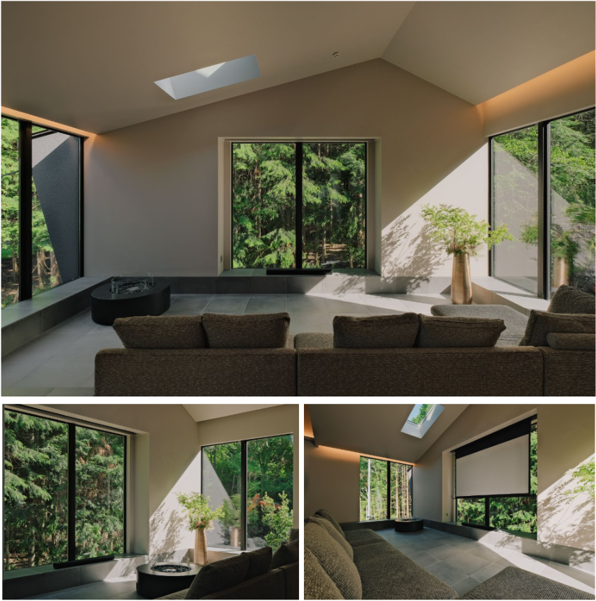 三方を大きな窓で囲んだリビングには、室内で火の揺らぎが楽しめるエタノール暖炉を配置。大きなソファーでくつろぎながら、スクリーンをおろせば、映画や動画を鑑賞することもできます。