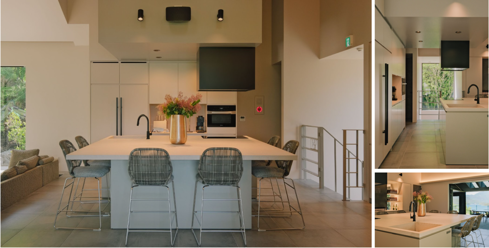 norm.のアイコンでもあるアイランドキッチン。全ての面が作業する際の正面になるように方向性をなくすよう設計され、シーズナルで変わる装花で季節感を味わっていただけます。IHクッキングや、コーヒーメーカーなどご滞在で必要なツールは完備しており、充実した料理体験をお楽しみいただけます。また、河口湖近隣の名店と提携し、出張シェフプランもご用意しています。