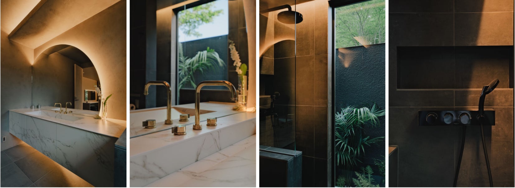 寝室からつながるパウダールームには、トイレ、シャワー、大きな鏡とシンク。シャワールームからは屋外にデザインしたボタニカルスペースを窓越しに眺めることができます。