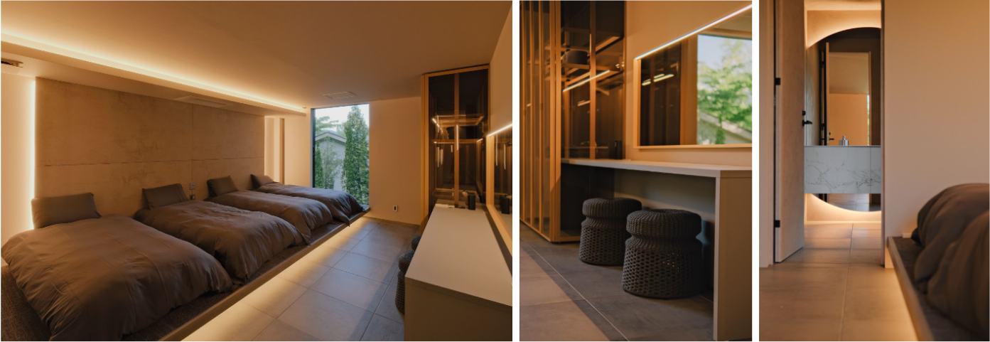 施設には最大8名様がご宿泊できます。ベッドルームは2部屋あり、それぞれにパウダールーム、シャワールームをご用意。特注の衣装棚にはご滞在中に使用していただけるオリジナルのバスローブやアメニティをご準備しております。また、デスクとWi-Fiも用意しており、ワーケーションにもご利用いただけます。