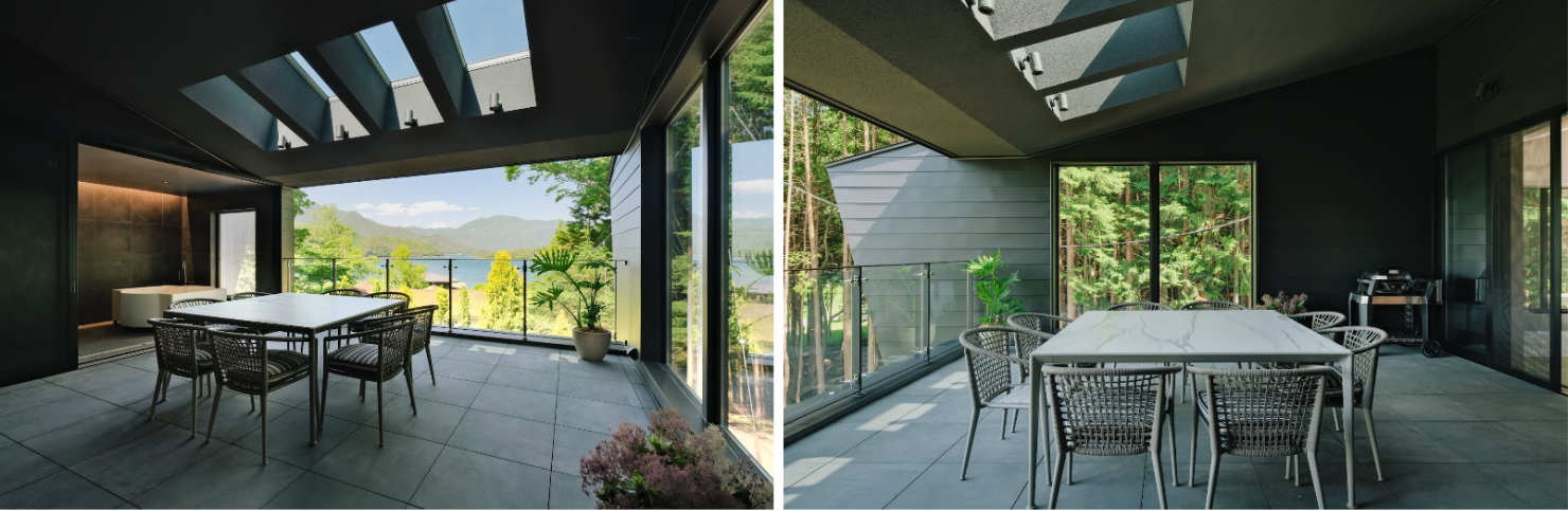 河口湖が望めるバルコニーは、キッチンスペースと仕切るガラスドアで、屋内としても屋外としても楽しめるあいまいな空間として設計しました。ご滞在中、メインに過ごす場所となります。日中は備え付けのグリルでバーベキューをしながら語らい、夜は星を見ながらゆったりと過ごす空間。