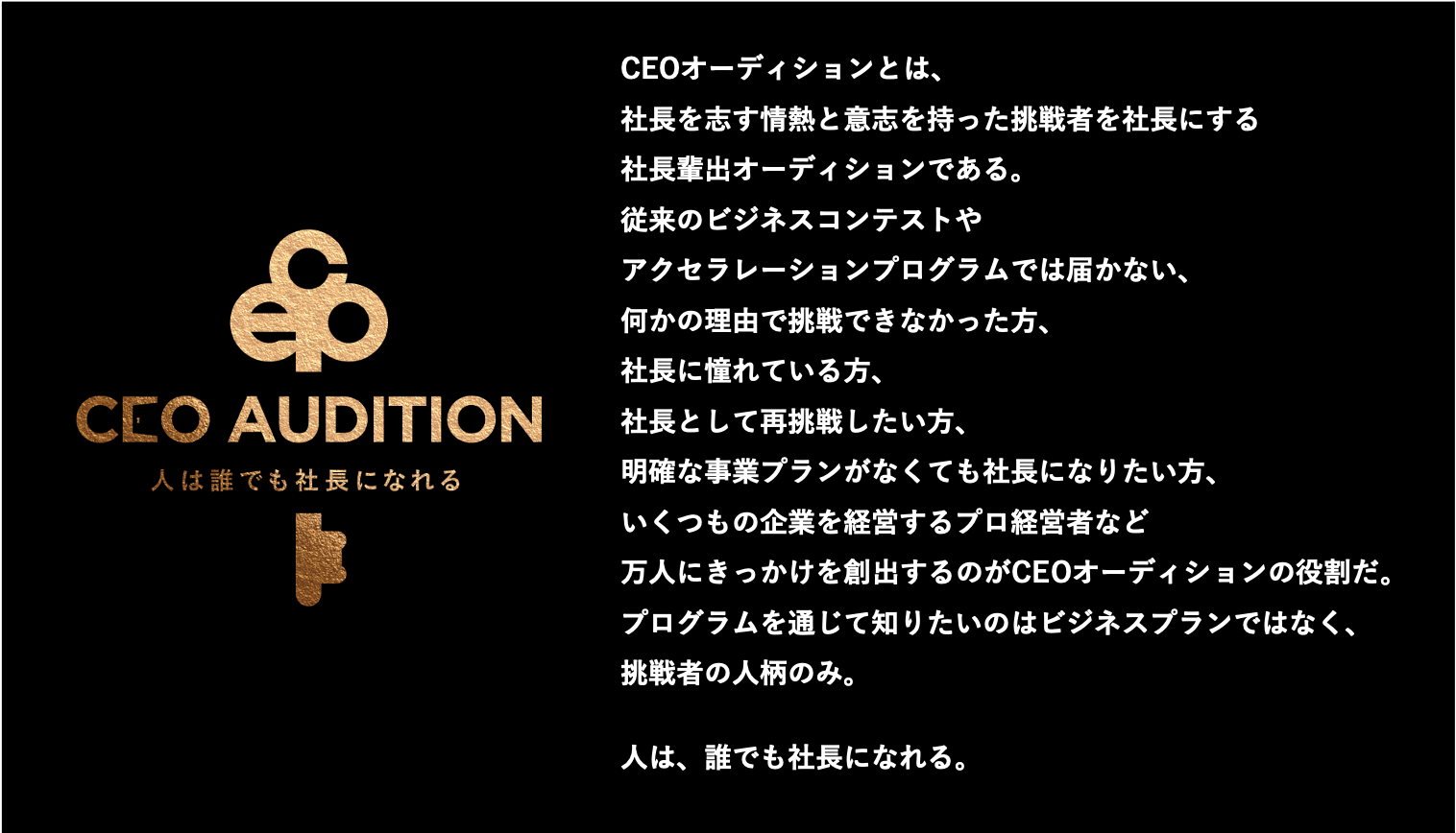 CEOオーディションでは、ビジネスの経験がない人でも、現時点でビジネスがうまくいっていない人でも、どのようなハンディキャップを持っていたとしても、意志と情熱さえあれば社長というキャリアを築き、活躍することができることを証明したいと考えています。