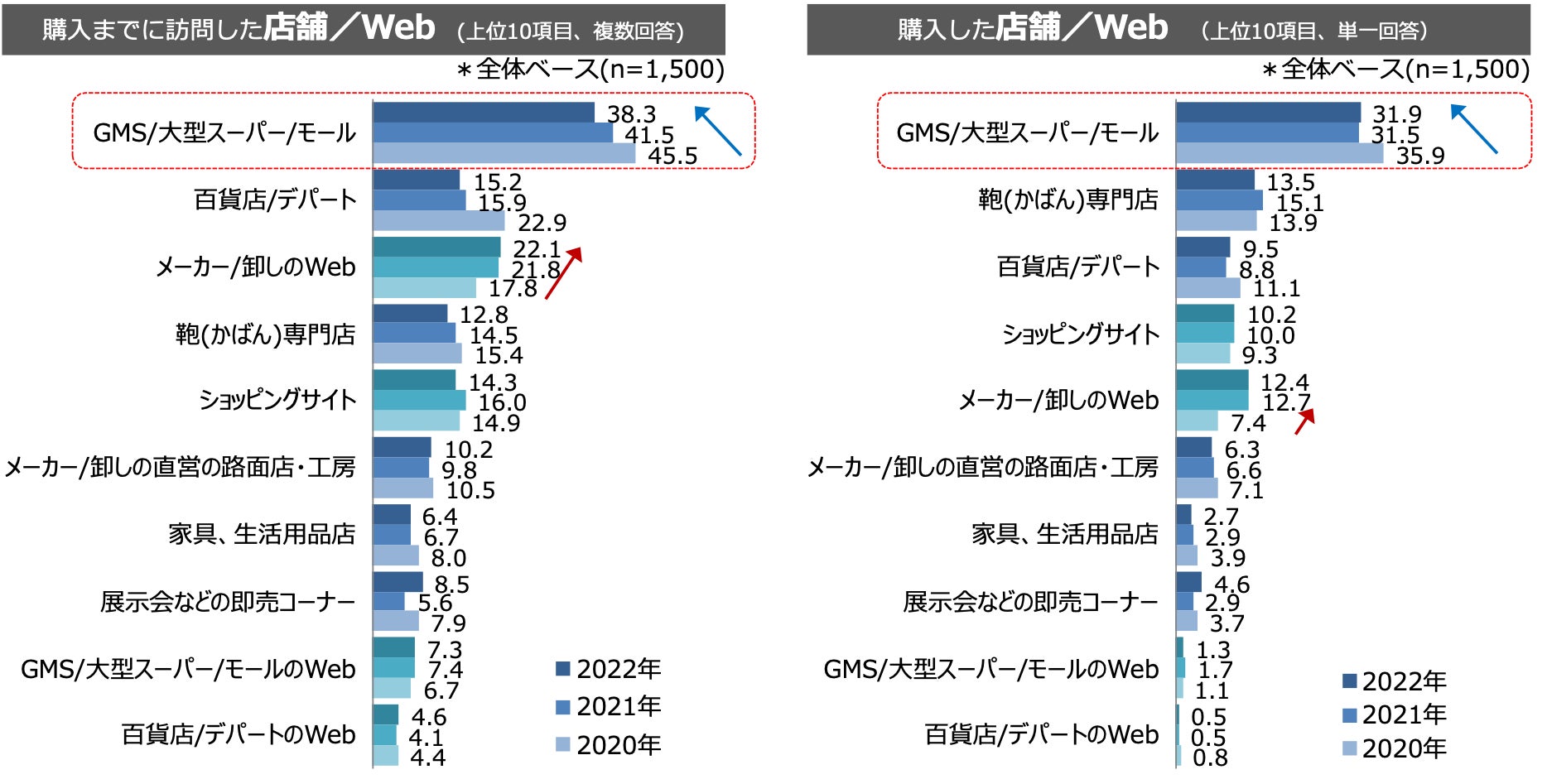 ・「GMS/大型スーパー/モール」は検討時の訪問先としても購入した場所としても昨年同様にトップとなるが、回答率が低下傾向にある。