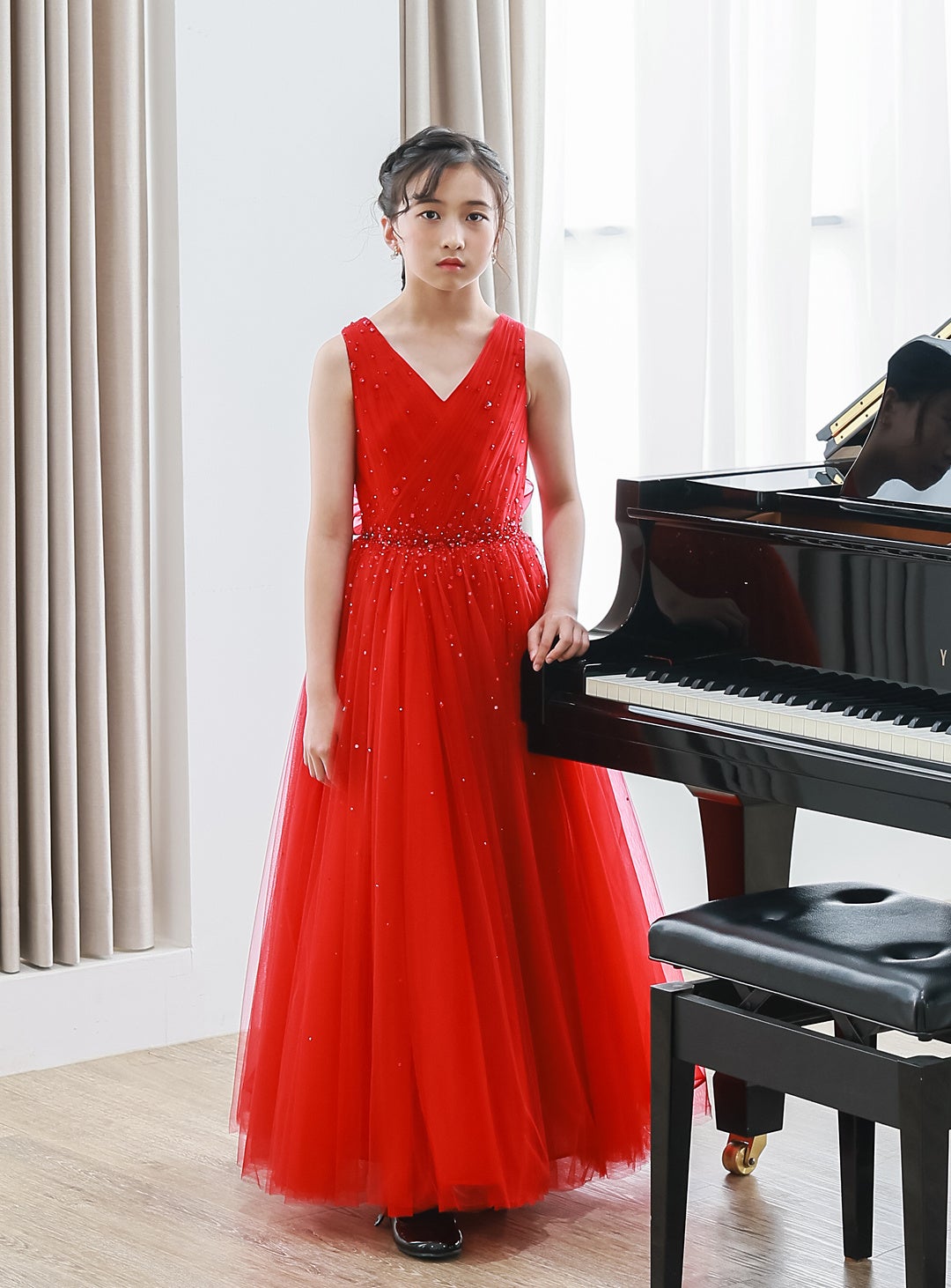 鮮やかなレッドカラーのチュール素材をふんだんに使ったクラシカルな1着。