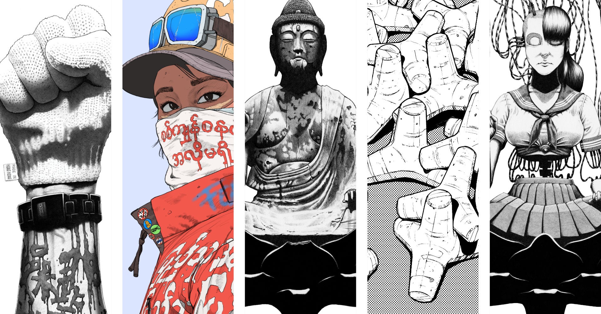 伝統的手法とデジタルを駆使して描いた作品は、社会の断絶、ディストピア、人間性といったテーマを取り上げる一方で、自身の学生時代を彩った映画のサブカルチャーや青春、政治を表現している。