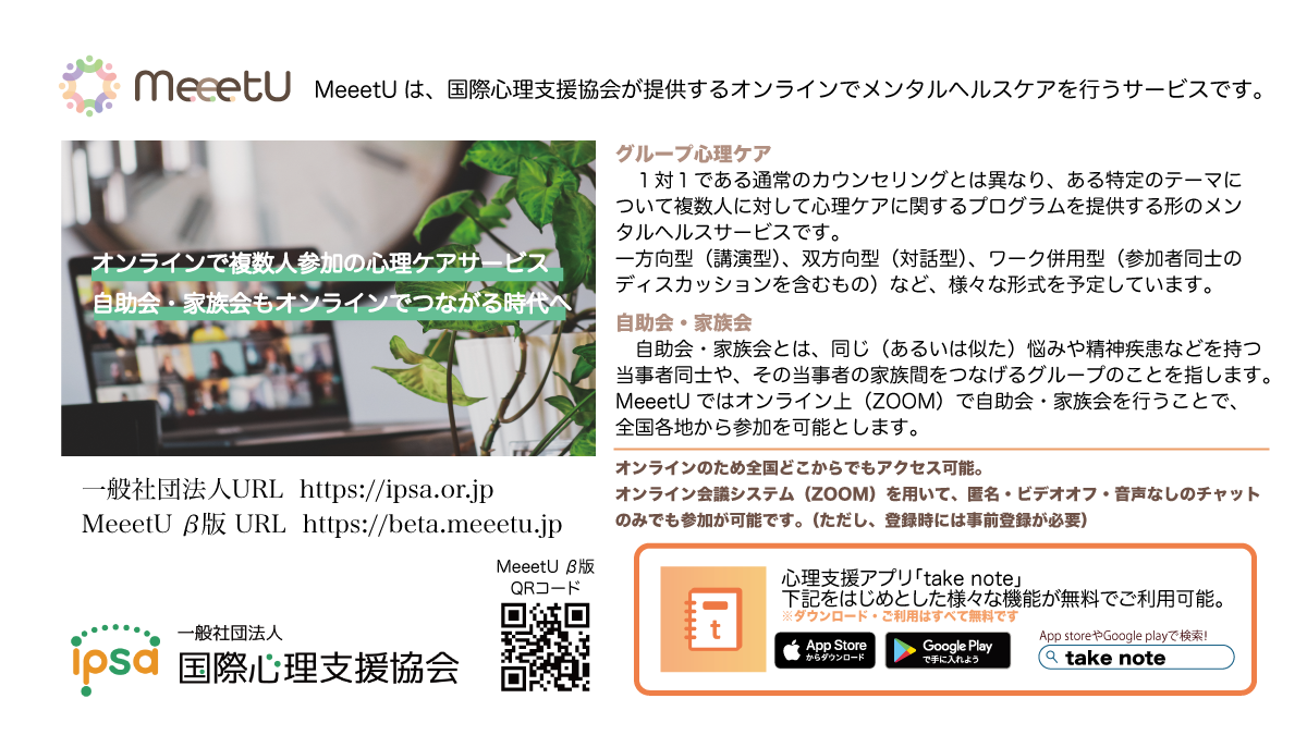 東京・大阪・オンラインで臨床心理士・公認心理師によるカウンセリングを提供している一般社団法人国際心理支援協会から、こころの健康に関する知識や心理ケア、自助会・家族会の場を提供するオンラインサービス「MeeetU」のβ版(https://beta.meeetu.jp)が、2022年7月9日より公開されました。