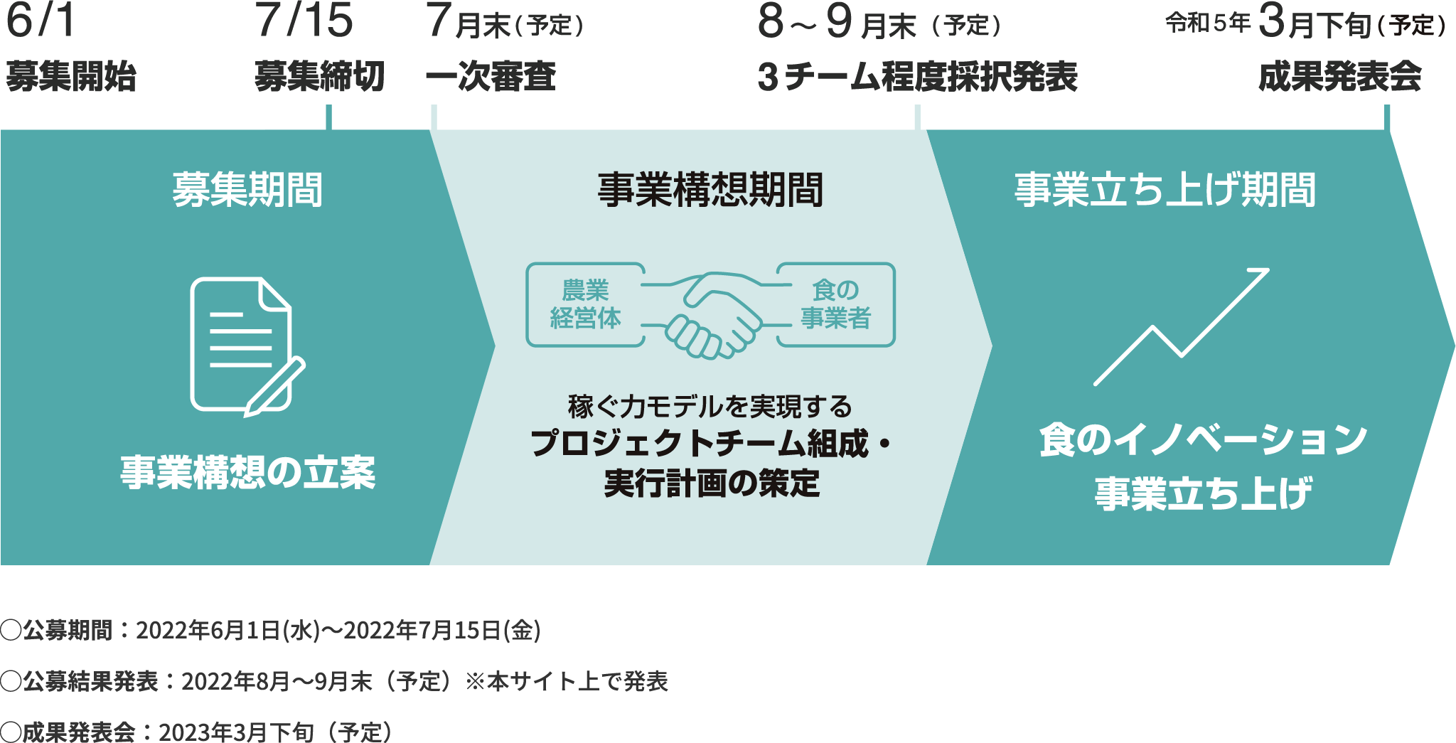 これまで本事業では、4月から5月にかけて様々な事業者へのヒアリングを通じて食のバリューチェーン全体のリアルなニーズ・課題を発掘し、食の「稼ぐ力」を高める事業モデルの仮説構築を行ってまいりました。今回の募集では、この「稼ぐ力」モデル仮説を踏まえた募集テーマの下、食のイノベーションに取り組む意欲的な事業者と共にプロジェクトチームを組成し、イノベーション事業の創出にチャレンジすることで、県内産業の振興に資する「稼ぐ力」ビジネスモデルの創発を目指します。