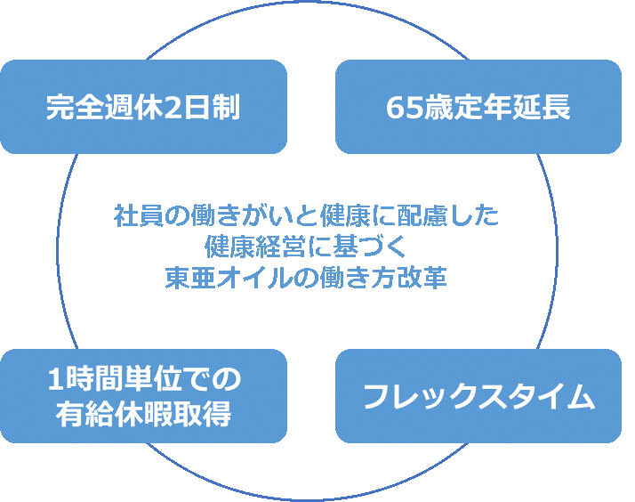 東亜オイル興業所は、業界ではまだ少ない完全週休2日制を含む大幅な働き方改革を実施し、社会的責任に則った健康経営を推進します。
