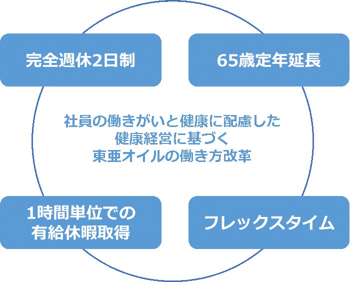 廃油の収集・処理からトータルリサイクルまでを担う株式会社東亜オイル興業所(本社:千葉県八千代市、代表取締役:安池慎一郎、以下、「東亜オイル」)は、この度、社員の健康や働きがいに配慮した健康経営を推進するため、完全週休2日制の導入、65歳定年延長、1時間単位の有給休暇の取得制度の導入、フレックスタイム制の導入を通じた大幅な働き方改革を行い、5月1日より各制度の運用を開始しました。
