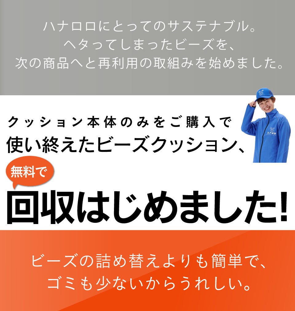 ・2021年よりへたってしまったビーズの無料回収をはじめました。回収したビーズは弊社で再利用し、新たな製品に生まれ変わります。