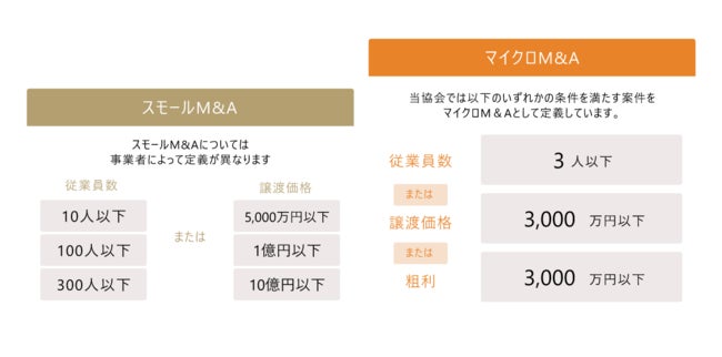 当協会では「譲渡価格」と「従業員数」によって定義し、譲渡額3,000万円以下、又は従業員数3人以下、粗利3,000万円以下、のいずれかの条件を満たすM&AをマイクロM&Aとしています。